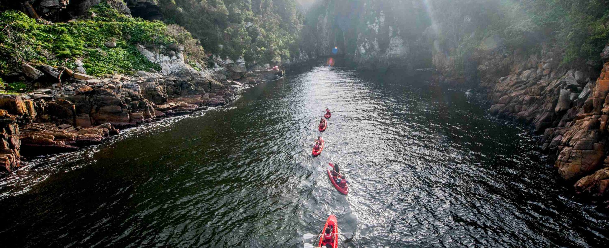 Padle, flyte og hoppe… det oppsummerer kajakk- og lilo-eventyret ved Storms River Mouth i Tsitsikamma nasjonalpark. Den 2 til 3 timer lange turen begynner enten med kajakkpadling over havet under hengebroen eller med fottur gjennom skogen for å starte høyere oppe, avhengig av sjøforholdene. Du padler gjennom kløften, forbi grotter, klipper og lange strekninger med stille vann, før du bytter til en lilo for å flyte dypere inn i smale deler av elven. På tilbakeveien kan du velge å hoppe fra klippene ned i de dype bassengene, eller du kan bare nyte den rolige turen tilbake.