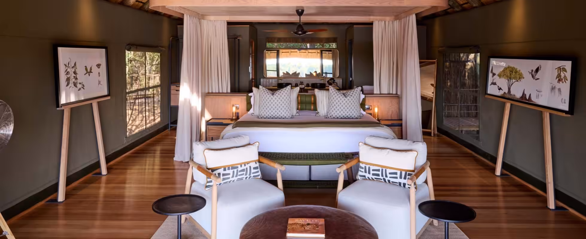 Savute Safari Lodge ligger langs den dynamiske Savute-kanalen i Chobe nasjonalpark og har plass til opptil 24 gjester i 12 hytter av tre og stråtak, inkludert en familieenhet med sammenhengende rom. Hver hytte har egen terrasse, eget bad og en kombinert stue og soverom. Hovedhytta har stue, bar, spiseplass og utsiktsdekk, mens svømmebassenget og utendørs bålplassen har utsikt over et vannhull som ofte besøkes av elefanter. Med elegante fellesarealer og intime hytter med utsikt over elven, tilbyr hytta komfort kombinert med dyreliv i første rad.