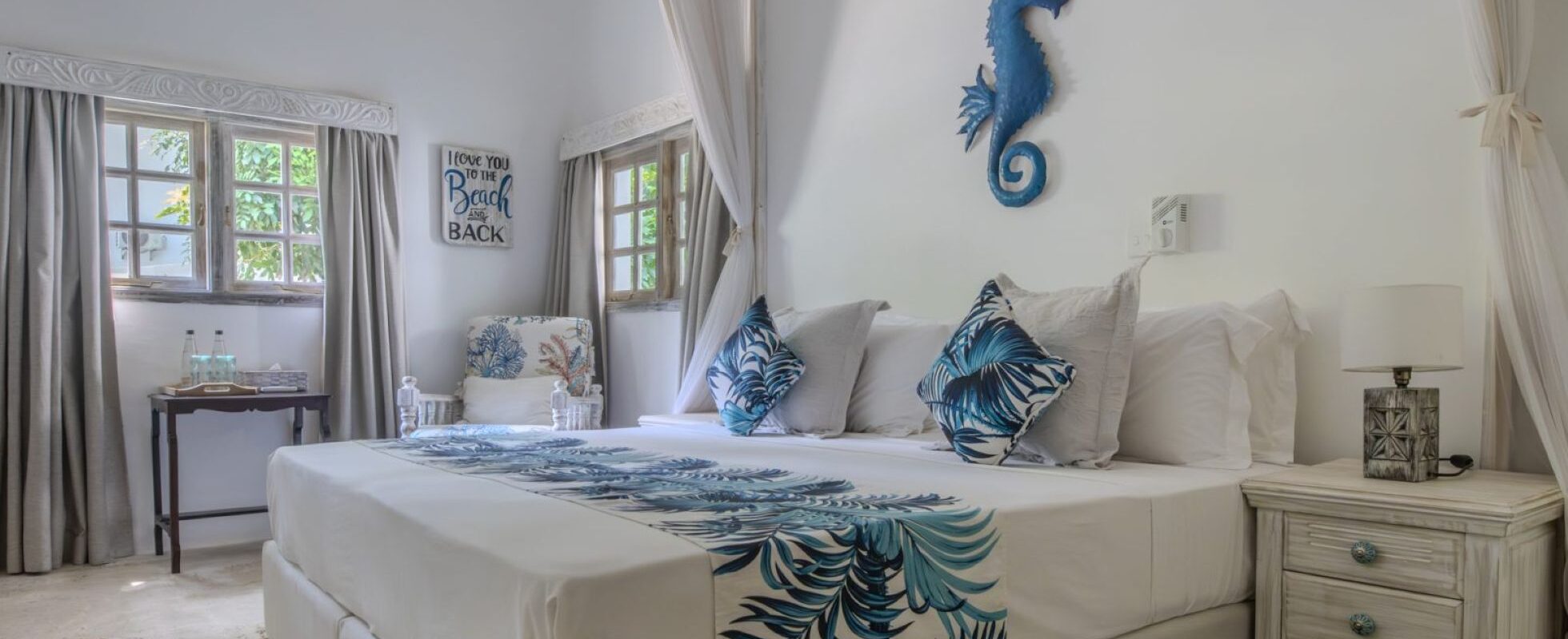 Feriestedet ligger på den verdensberømte Diani Beach nær Mombasa og tilbyr ni forskjellige romtyper, alle velutstyrte, noen med egen boblebad, terrasser med panoramautsikt og separate stuer for ekstra komfort. Familier vil finne god plass i de romslige rommene i første etasje i hovedbygningen i hacienda-stil, mens par kan nyte roen i de romantiske strandhyttene, bare noen få skritt fra Det indiske hav. Det er også en liten hage med solsenger, perfekt for å slappe av etter en dukkert i havet.