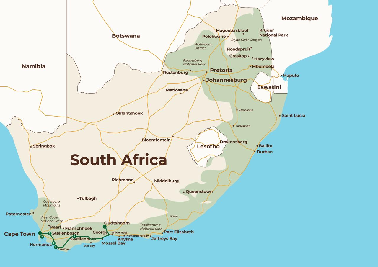 En fin måte å starte eventyret ditt i Sør-Afrika på, er å varme opp med vinsmaking i Robertson. Deretter drar du videre til Oudtshoorn, hjertet av Small Karoo, som er kjent for strutsefarmer, eldgamle grotter og spennende safariturer.